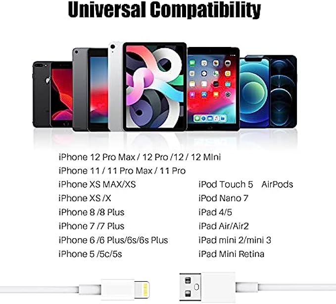 • 【Massive Compatibility】iPhone Charger Cable for iPhone 13 Pro Max/iPhone 12 Pro Max/12 Mini/12/iphone xr /iphone xs / xs max /iphone x/ iphone 11/iphone11 pro/iphone 11 pro Max, iPhone 8 / 8 Plus, iPhone 7 / 7 Plus, iPhone 6s Plus / 6s / 6 Plus / 6, iPhone 5s / 5c / 5 / SE/iPad Pro/Air/Mini and more.
