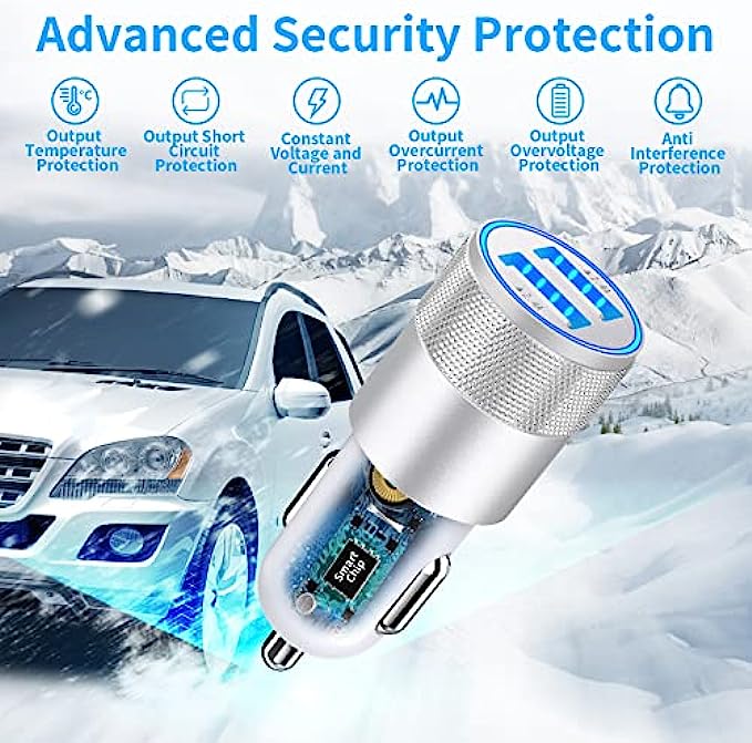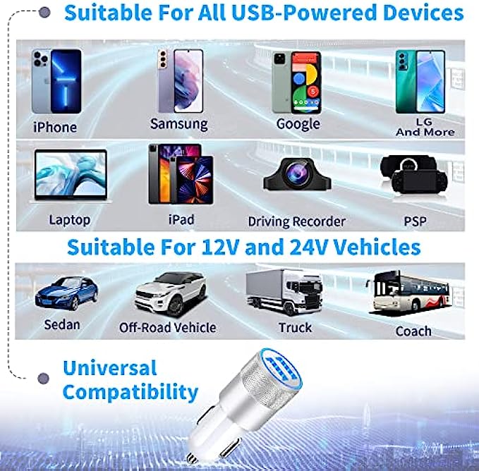 • 【Premium Materials and Design】: The housing made of an aluminum alloy + ABS fireproof materials offers better scratch resistance, heat dissipation, attractive design, and long service life, suitable for the most untouched vehicle interiors. Gold-plated tubing reduces heat during charging while maximizing charging speed and efficiency. The ring LED indicator can help you to find the charging ports easily in the dark, Easily fits in a car cigarette Lighter socket with limited space.