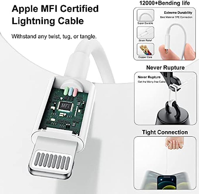 ?【20W Fast Charging&Syncing 】Charging iPhone 13 12 from 0% to 70% in just 30 mins.PD 3.0 Quick-Charge USB C charger with 10ft type c to lightning cable saves more than 1 hour for you when compared to the 5W original charger.It also support the fast data transfer rates up to 480Mbps.Enjoy your faster charging and data transfering.