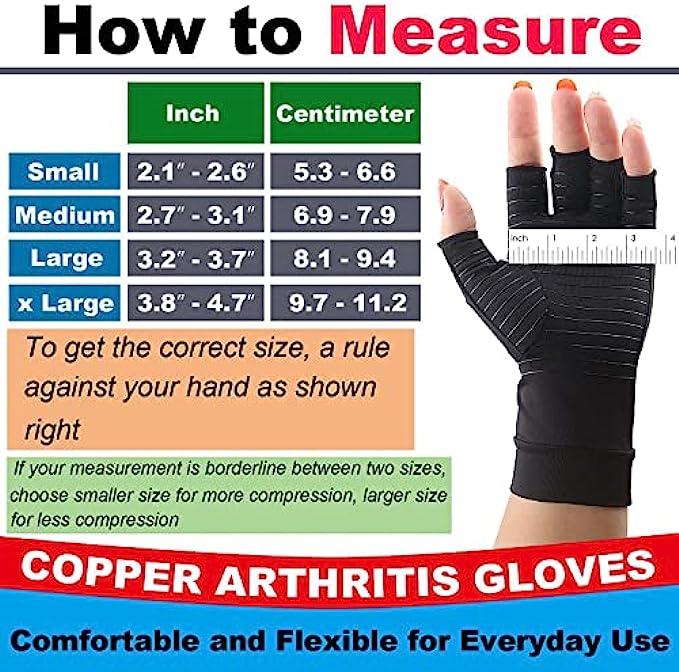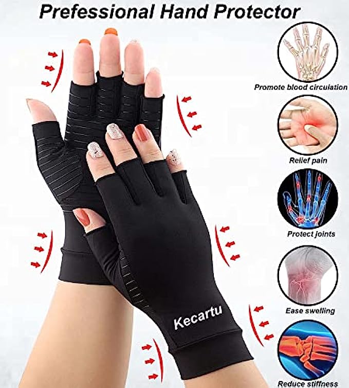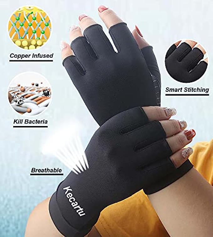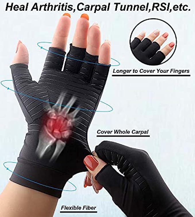 • 【Fingerless Cooper Arthritis Gloves】- Fingerless Copper Arthritis Compression Gloves allow you to touch and grip freely, perform everyday tasks like using phone, typing, cooking and more without interference. Opening is set at optimal length to provide perfect balance between beneficial compression support and finger / thumb mobility.
