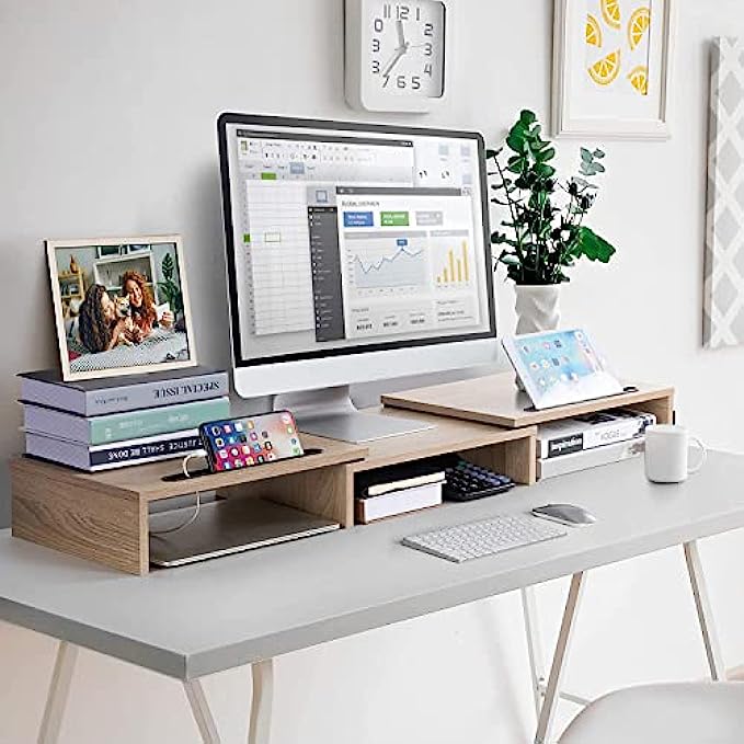 GET A TIDY WORKING SPACE: Lift your monitors by the desktop shelf and store your keyboard, office files, notebook, calculator underneath it. Get rid of messy desk, keeps your working space tidy.