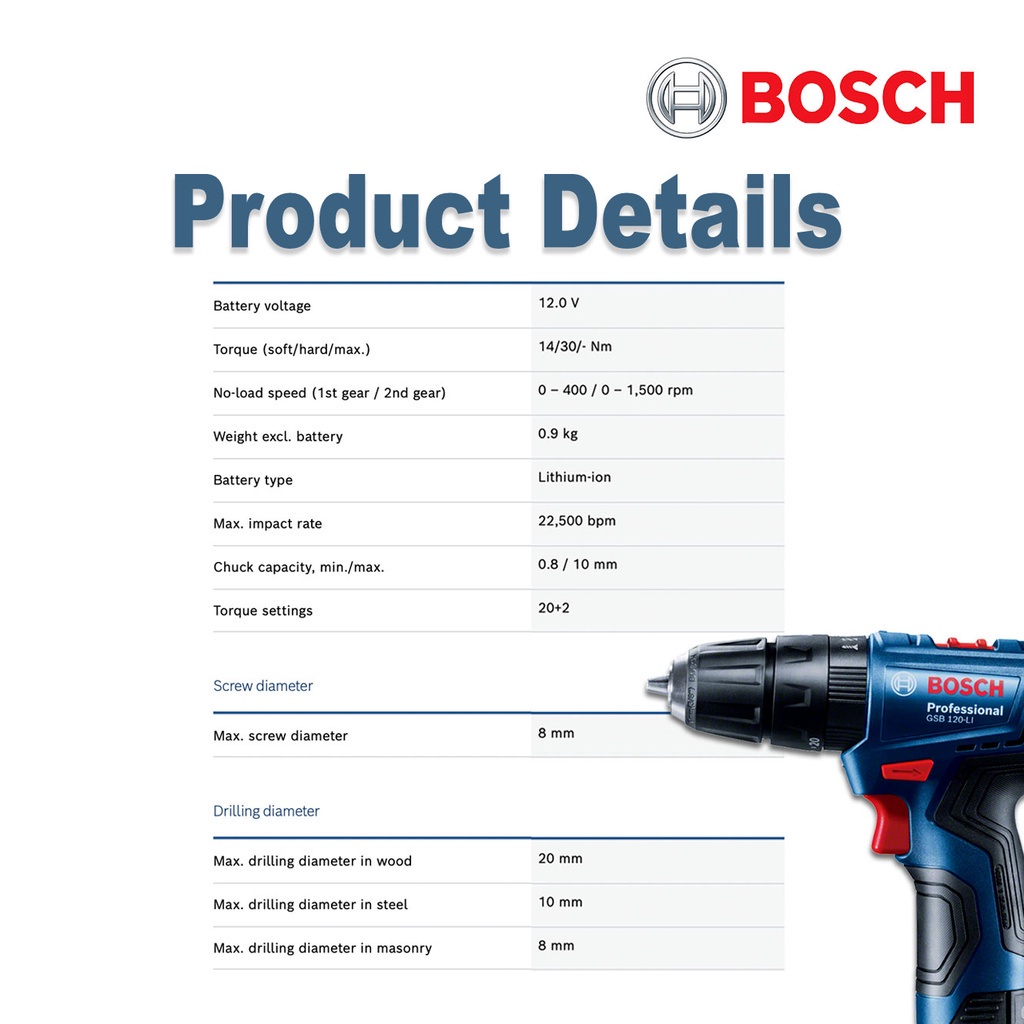 BOSCH GSB 120-LI GEN 2 Cordless Impact Drill SOLO GBA 12V 2.0Ah Li-ion Battery GSB120 GSB 120 06019G81L0 FAMILY