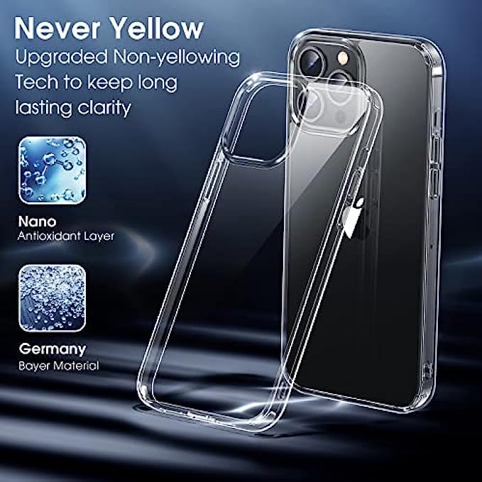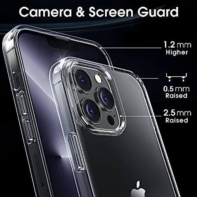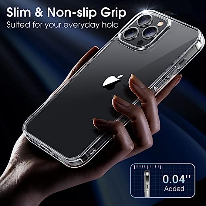 [Crystal Clear & Never Yellow]: Using high-grade Bayer's ultra-clear TPU and PC material, allowing you to admire the original sublime beauty for iPhone 13 Pro Max while won't get oily when used. "Never yellow" thanks to the nano-grade diamond anti-oxidation coating which can effectively resist 99.9% of yellowing caused by ultraviolet rays and sweat. [Military-grade Protection]: Equipped with Flex-impact Cushion Tech to disperse severe shocks, guaranteed with [MIL-STD-810G] standard. The backplane is made with rigid polycarbonate and flexible shockproof TPU bumpers around the edge to create tough protection. [Raised Camera & Screen Protection]: Raised bezels prevent screen and camera against drops & scratches. The tiny design of 2.5 mm lips over camera, 1.2 mm bezels over screen and 0.5 mm raised corner lips on the back provides extra and comprehensive protection. [Fit Snugly & Slim Design]: Crystal Clear Case wraps seamlessly around your phone to stop dust from entering and scratching your phone. And pairs perfectly with most screen protectors in market. 0.04 inch ultra-slim allows your phone to fit easily your pocket. [Anti-fingerprints & Non-slip Grip]: Processed TPU frame provides a secure non-slip grip designed for texting, gaming and selfies. Upgraded ultra-clean backplane, adding exclusive AF Anti-fingerprint coating can effectively reduce fingerprint residues and enjoy long-term cleanliness?️Any product issues, please contact us via Amazon Message Center.