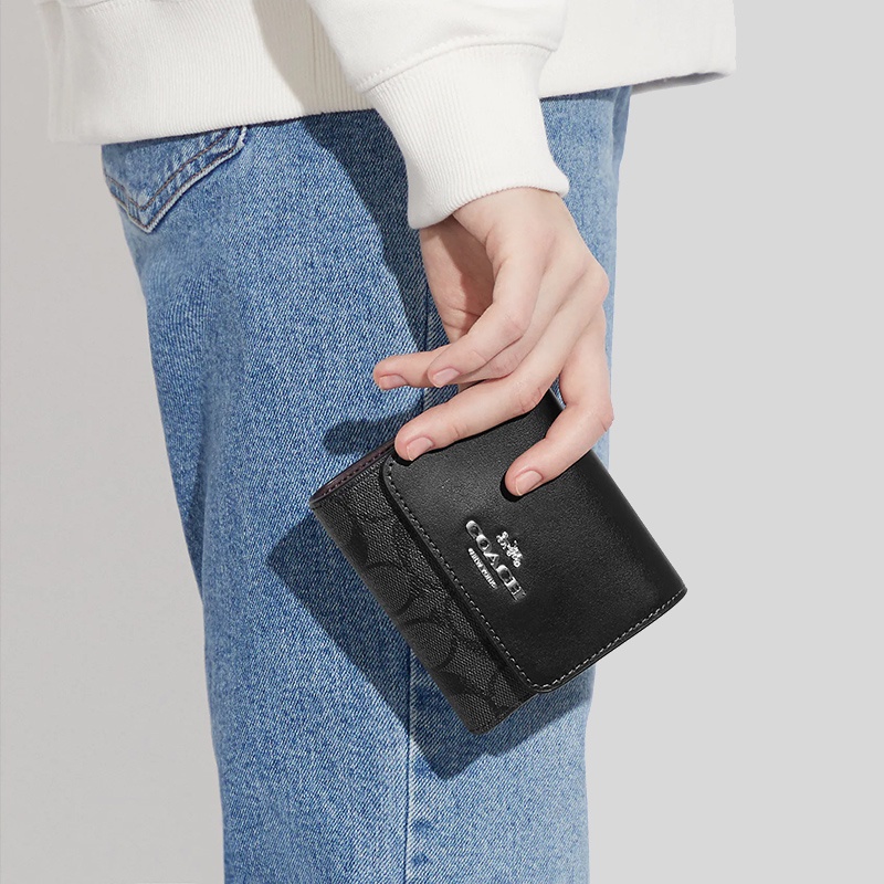 Coach Small Trifold Wallet In Blocked Signature Canvas Graphite Black CE930