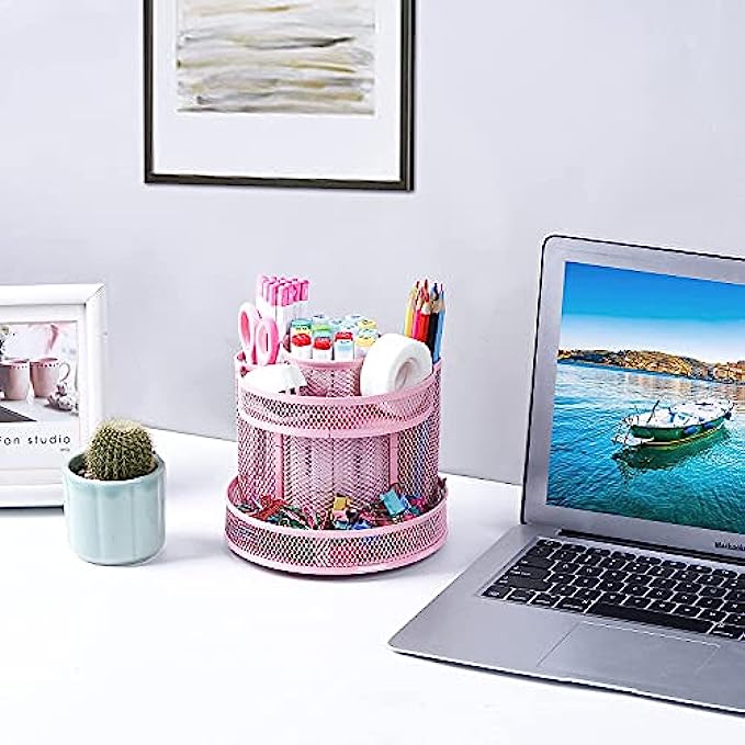 【360 DEGREE REVOLVING DESIGN】 This desktop organizer can be turned up to 360 degree rotation to the left and right .You can easily reach out to something useful and practical you need during working or studying.The product can be bilaterally and smoothly rotated, just turn as you please.