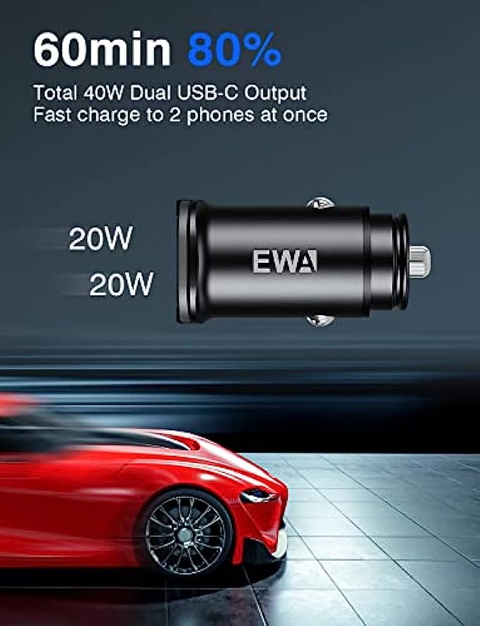 EWA USB C Car Charger, 40W(20W+20W) Dual PD Port Smallest iPhone 13 Car Charger, All Metal Car Charger Adapter, Fast Charging Compatible with iPhone 13/12/Pro/Pro Max/Mini/MagSafe, Galaxy S20/S10