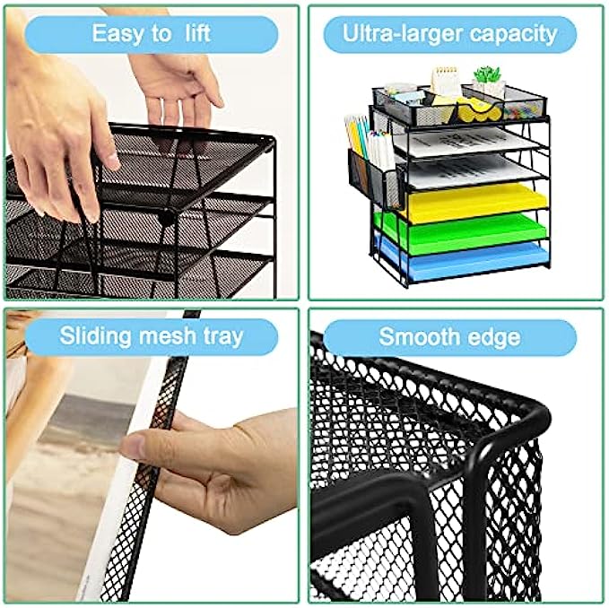 【Unique Mesh Desk Organizer】Desk file organizer you can organizer printed paper, letters, statements, folders, documents, magazines, desk accessories, desktop organizer with 5 Stackable trays and 1 sliding drawer + a pen holder divided in two. Desk organizer is the highest end of office organization design.