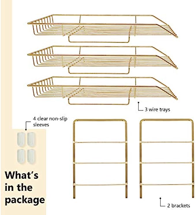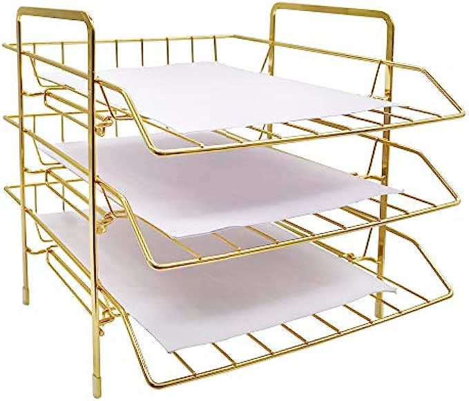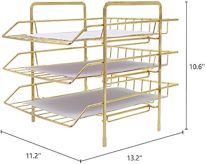 ✔️【SIZE】13'' x 10.8'' x 10.6''. This gold paper tray utilize vertically-stored space, maximize use your desktop workspace. Keep your office and learning environment tidy and convenient.