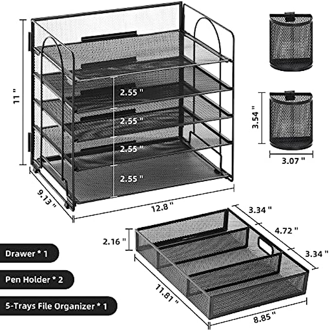 Marbrasse 5-Trays Desktop File Organizer with Pen Holder | Paper Letter Tray with Drawer and 2 Pen Holder | Mesh Office Supplies Desk Organizer for Home Office (Black)