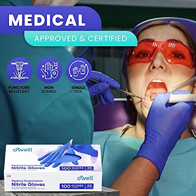 • MEDICAL GLOVES: OWELL nitrile examination gloves are certified, compliant, and approved for medical use. OWELL medical exam gloves are non latex, non sterile, single-use only, chemical & puncture resistant and are the go-to choice gloves disposable latex free X-Small for doctors, nurses, physicians, first responders, pharmacists, labs, clinics, and health care providers.