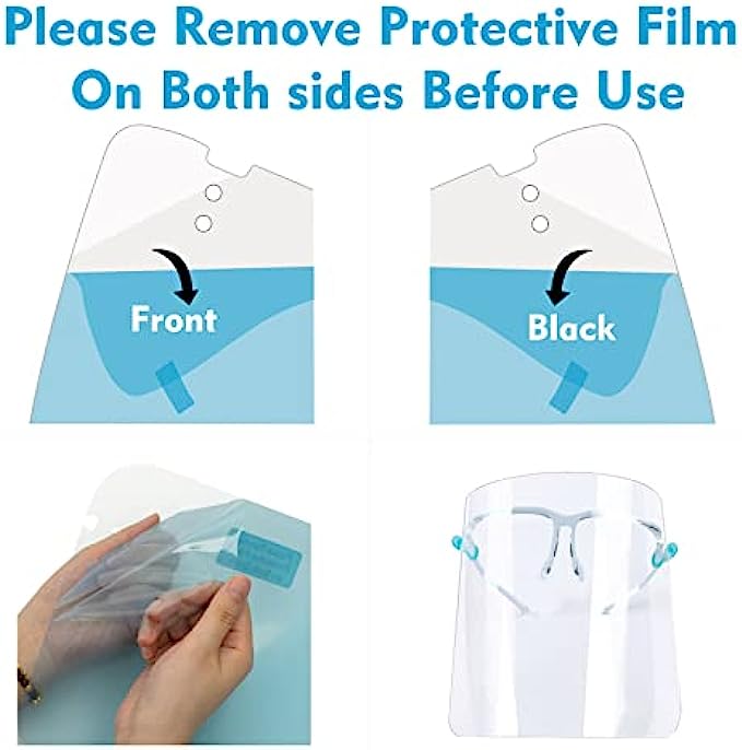 • First use please tear off the films before use, there are 2 protective films on the safety face shield anti fog, one layer inside and one layer outside.High light transmittance after tearing off the protective film on both sides of the face shield glasses.