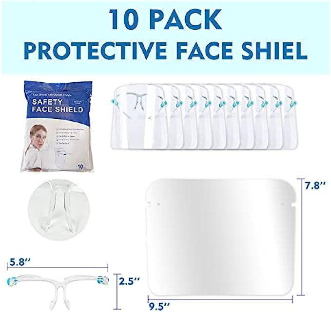 PANOPTX 10 Pack Safety Face Shields with Glasses Frame Anti-Fog Clear Face Shield Protective Full Face Shield Mask for Daily Use