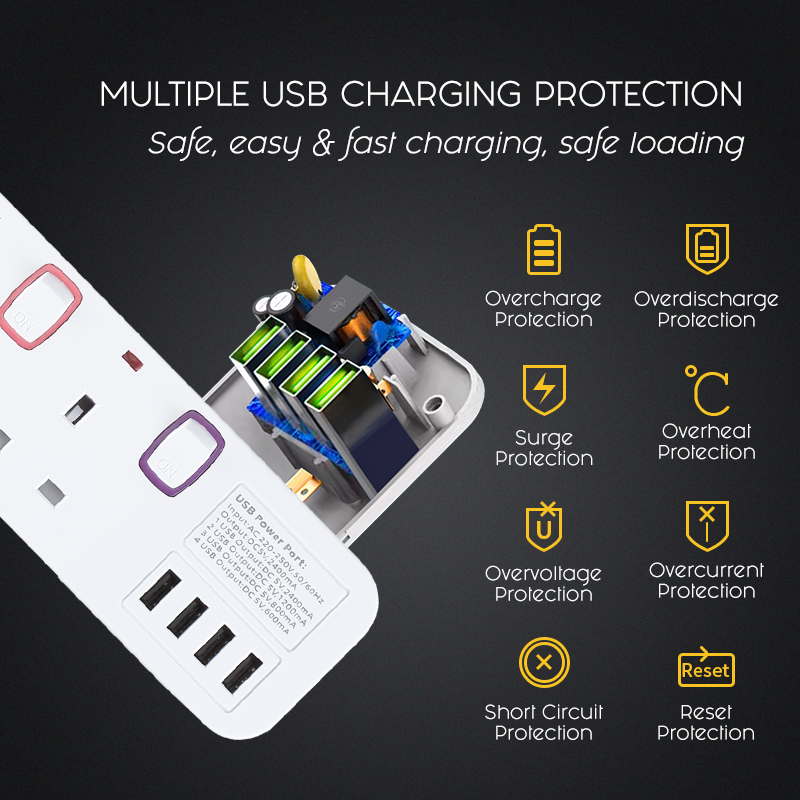 PowerPac Power Extension Socket Extension Cord 3/4/5/6 way 3 meter with 4x USB Charger (PP9113U to PP9116U)