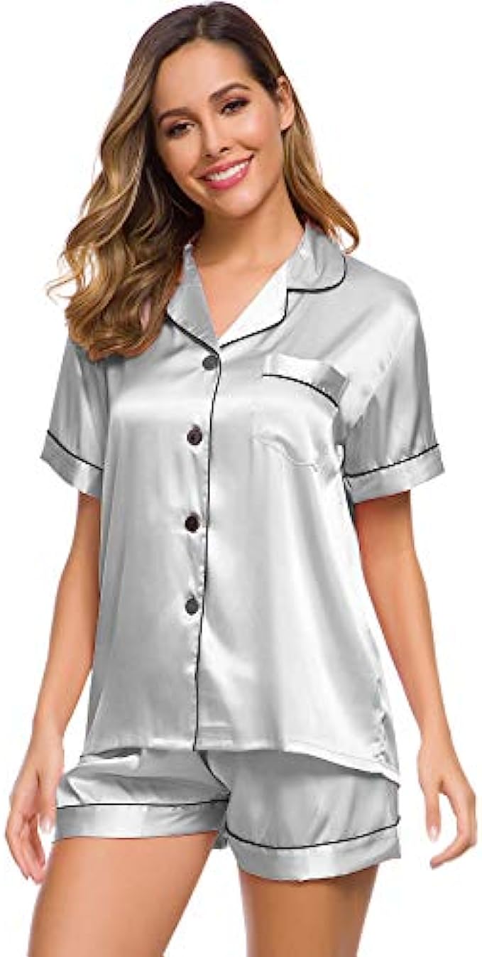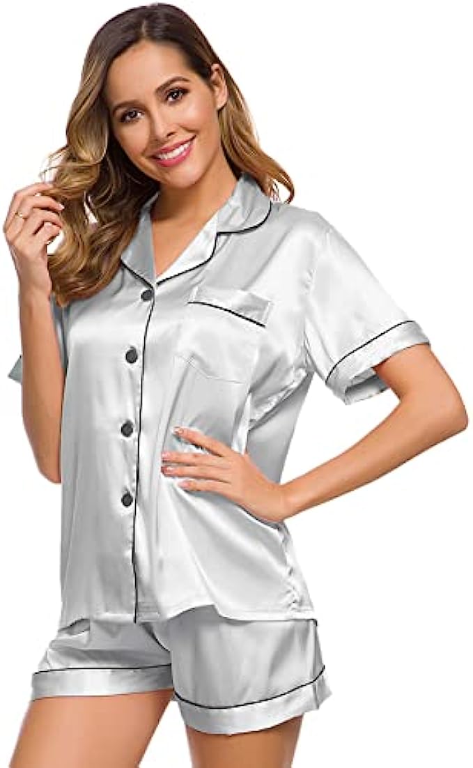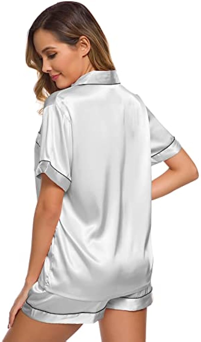 SWOMOG Womens Silk Satin Pajamas Set Two-piece Pj Sets Sleepwear Loungewear Button-Down Pj Sets