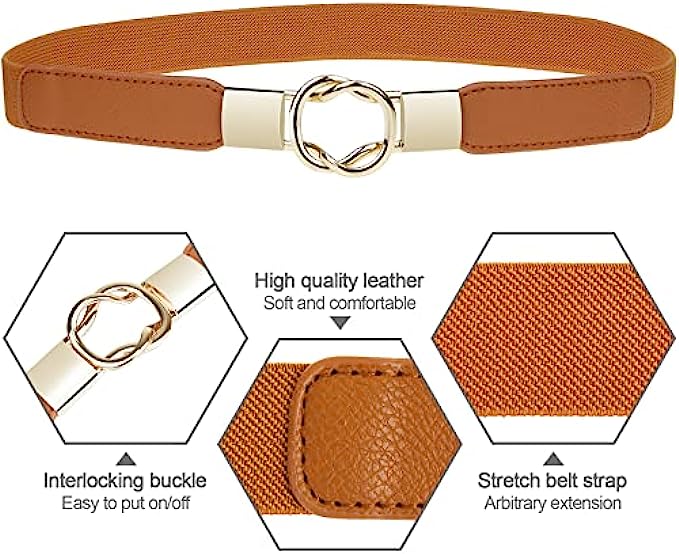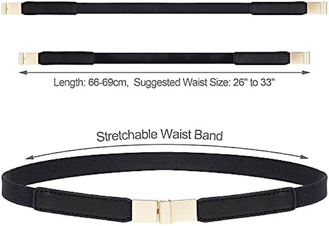 • 【Elastic Type Belt】Stretchy leather belts were made of PU leather, fabric and metal. The elastic band with flexible elasticity make the skinny waist belt suitable for most girls and women with waist size from 26” to 33”