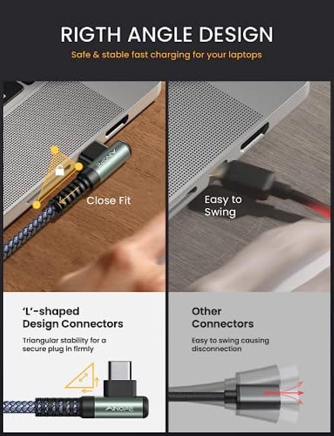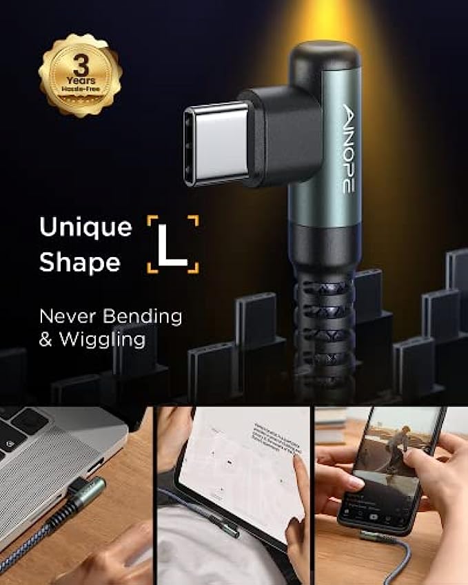 • ?"L" Connector Design, Prevent Bending & Breaking: This right angle type c to type c cable fast charge with an innovative 90 degrees "L" design. It's more convenient and comfortable for playing games, watching videos, reading e-books when you charging. A comfortable grip brings you an immersive operating experience, It completely solves the troubles of ordinary wires that are easy to block hand, unintentionally interrupted and the bending of the connector while using while chargin.