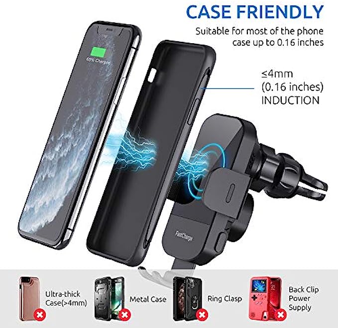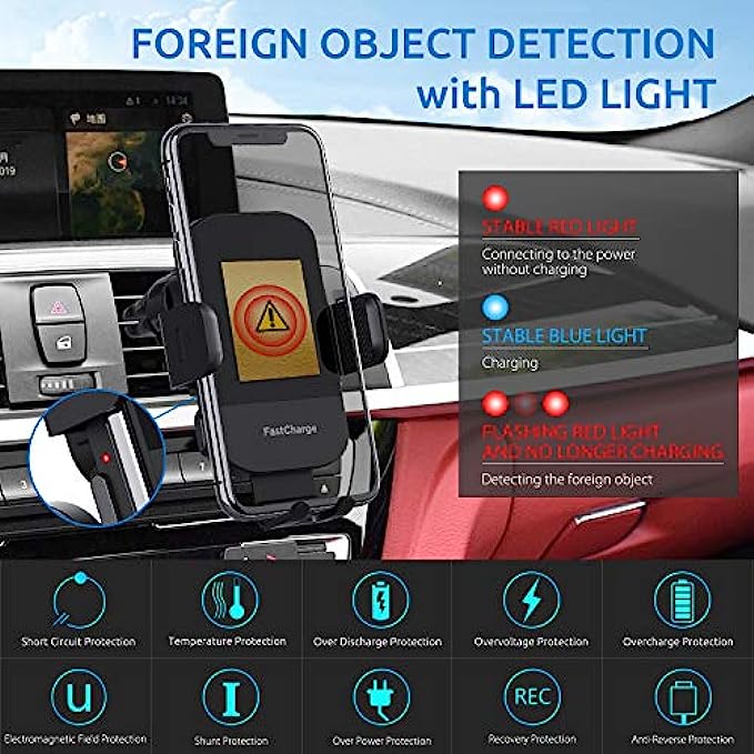【QI WIRELESS CHARGER】Built-in upgraded chip, CHGeek wireless car charger intelligently identify and charges your device with the fastest speed in safe. Support max 15W max Fast Charger for LG V50 / V35 / V30, 10W Fast Charger for Samsung Galaxy S20/S20+, Max 7.5W Fast Charger for iPhone 11/11 Pro Max/1XS Max/XS/X, 5W for Other Qi-Enabled Phones.For 15W 10W, 7.5W fast charging mode, QC 3.0 car charger adapter is required as its power source.(1 * usb c charging cable is included in the package) 【INTELLIGENT IDENTIFICATION & SMART CHARGING】When connecting to the cable, the phone car mount will automatically clamp when phone is dropped in, make your driving easier and safer. A gentle touch on the 2 sides button of the charger can make the arms open. When your phone is fully charged, the wireless car phone charger will automatically power off and protect the battery of your phone 【FOREIGN OBJECT DETECTION with LED ALARM】When there is a metal substance between the wireless car charger mount and the phone, the car wireless charger will stop charging and the red light flashes to alarm. Effectively avoid the damage of the mobile phone caused by the high temperature of the metal 【CASE FRIENDLY & FLEXIBLE ANGLE ADJUSTMENT】CHGeek phone holder for car supports charging through phones cases up to 6mm thick. Please note that cases made of metal, external attachments such as magnets, credit cards, grips, and stands will interfere with charging. The 360°rotating sphere and the retractable & foldable bracket allows for optimum viewing and safe driving 【2-IN-1 Design】 Combines the Qi Wireless Charger and a car cell phone holder, allows for a secure hands-free experience. Keep you away from the tangled locating cords or cables. Cell phone holder is suitable for car Windshield Dashboard Air Vent installation, and makes GPS and phone call more convenient