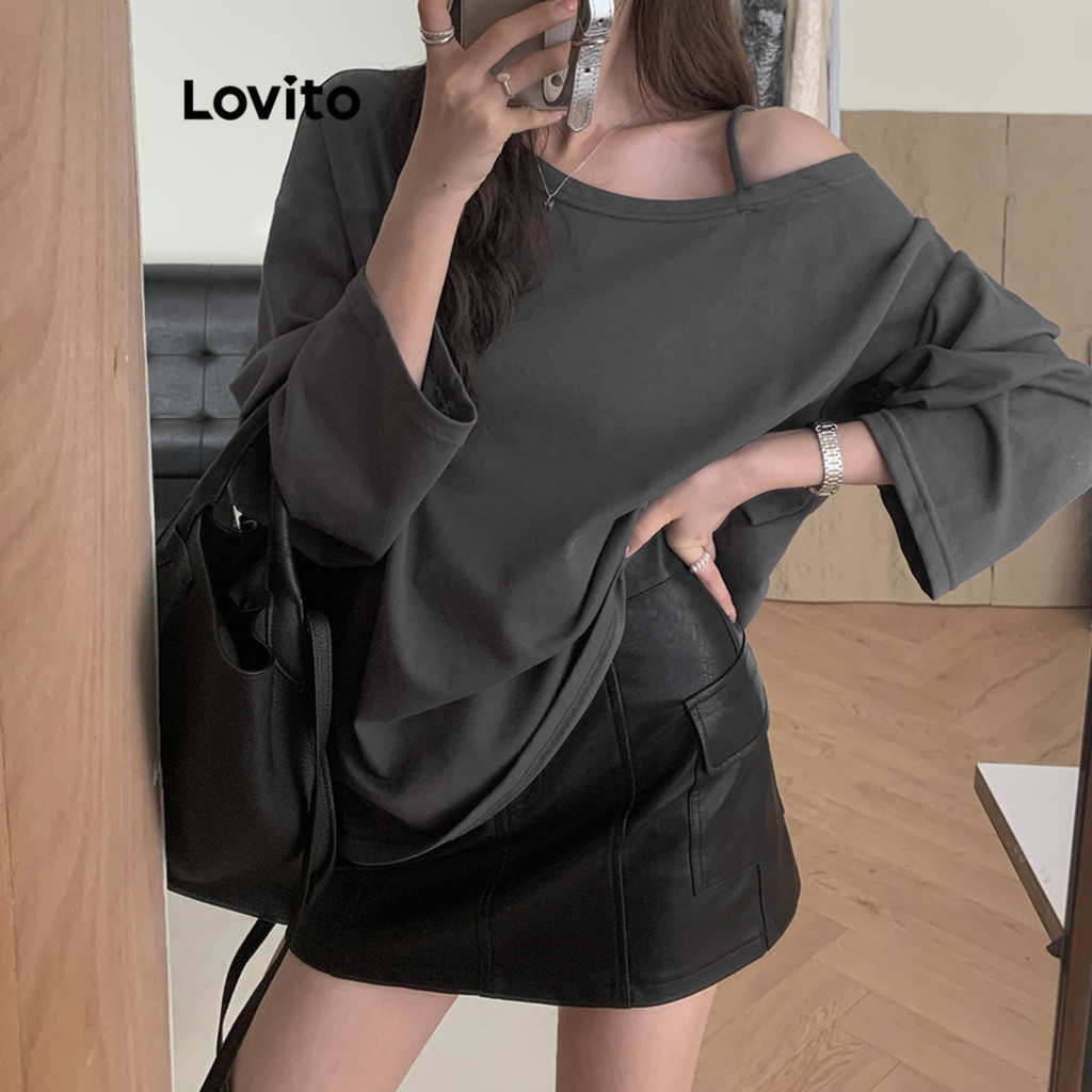 Lovito Casual Plain Asymmetrical T-Shirt for Women LNE24059 (Khaki/Dark Grey/Grey/White/Black)