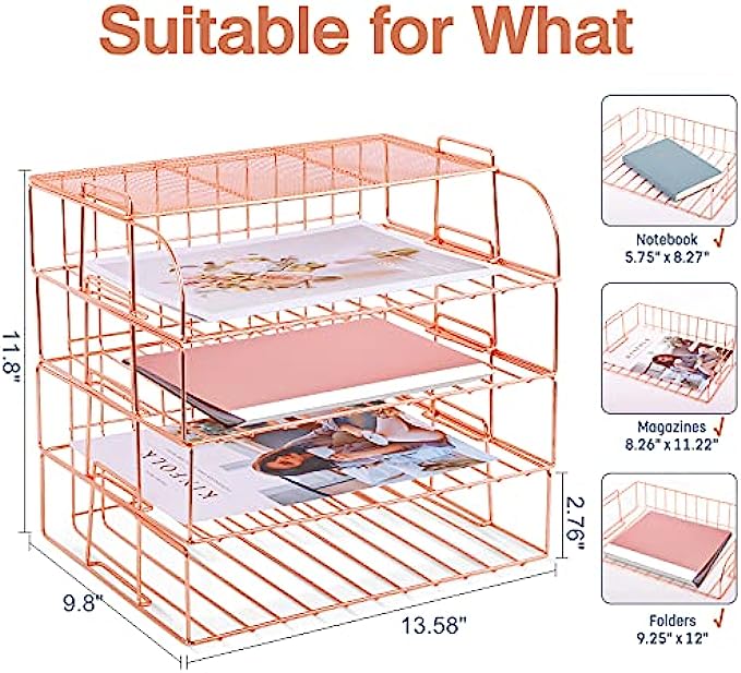 ▶Multifunctional Office Tray- This rose gold desk organizer includes four file trays and one upper display shelf plus a box of binder clips. Large enough to handle daily-used files, papers, letters, files, folders, mail and much more.