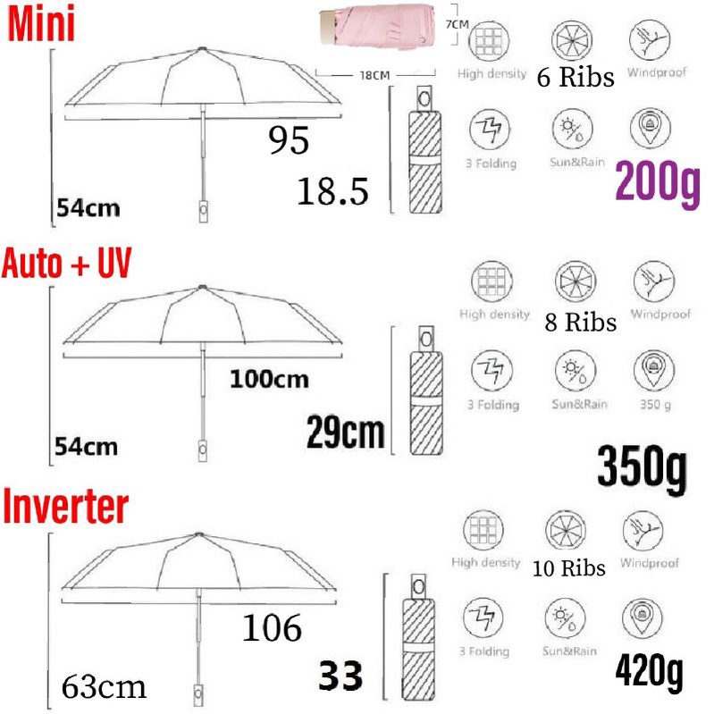 I like automatic. Nice small, colorful orange, thick UV umbrella. Length 28.5cm folded. Umbrella coverage diameter about 95cm. The Inverted umbrella is good for driver. length 34cm folded. Umbrella coverage diameter about 105cm.
